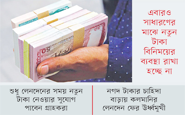 লকডাউন দেওয়ার আগে থেকেই নতুন টাকা বাজারে ছাড়া হচ্ছে। ব্যাংকের যারা গ্রাহক, তারা লেনদেনের সময় নতুন টাকা নেওয়ার সুযোগ পাচ্ছেন। এ ছাড়া এটিএম বুথেও মিলছে নতুন টাকা।