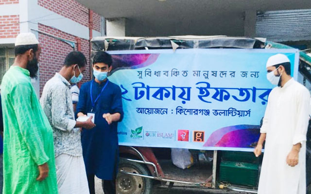 রহমত,মাগফিরাত আর নাজাতের মাস রমজানে কিশোরগঞ্জের সুবিধা বঞ্চিতদের মাঝে ‘কিশোরগঞ্জ ভলান্টিয়ারস’ নামের একটি সামাজিক সেবামূলক সংগঠন দুই টাকায় ইফতার বিতরণ কার্যক্রম চালিয়ে যাচ্ছে।
