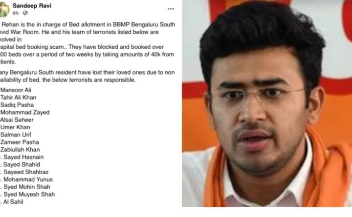 পশ্চিমবঙ্গের এনবি নিউজের বরাতে জানা যায়, দক্ষিণ বেঙ্গালুরুর BBMP covid war Room এ মোট ২০৫ জন কর্মীর মধ্যে মাত্রই ১৭ জন মুসলিম ছিল। তাদেরকে বিতাড়িত করে তাদের বিরুদ্ধে বিজেপির আইটি সেল ব্যবহার করে তাদেরকে হত্যাকারী, সন্ত্রাসবাদী ইত্যাদি ভুয়া অপমানজনক তকমা দিয়ে তাদের বিরুদ্ধে তদন্ত শুরু করতে বলেছেন এ এমপি।
