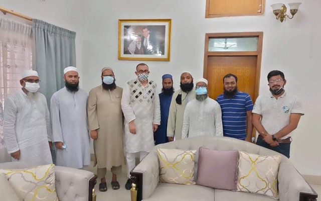 ঔষুধ নিয়ে ঢাকাস্থ ফিলিস্তিনের দূতাবাসে সৃষ্টির সেবা সংস্থা ও কুরআন ডোনেশন প্রজেক্টের কর্মকর্তারা[/caption]