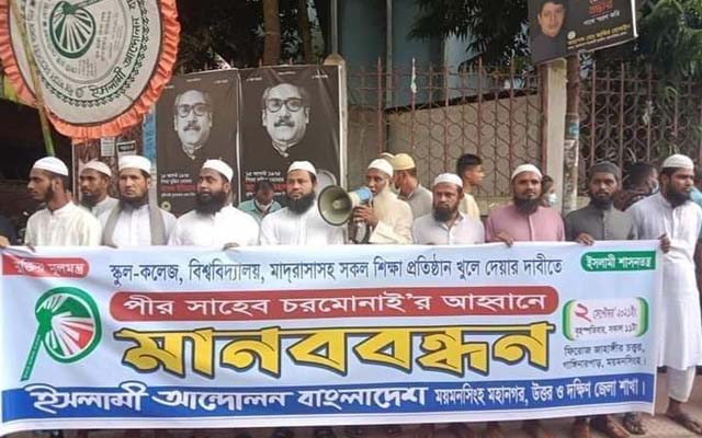 শিক্ষাপ্রতিষ্ঠান খোলার দাবিতে ময়মনসিংহে ইসলামী আন্দোলন বাংলাদেশ এর মানববন্ধন অনুষ্ঠিত হয়েছে। পূর্বঘোষিত কেন্দ্রীয় কর্মসূচীর অংশ হিসেবে আজ বৃহস্পতিবার সকাল ১১ টায় ময়মনসিংহের ফিরোজ-জাহাঙ্গীর চত্বরে এ মানববন্ধন কর্মসূচি পালিত হয়।
