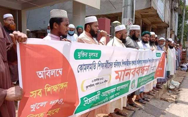 মানববন্ধনে বক্তারা বলেন, দীর্ঘদিন শিক্ষাপ্রতিষ্ঠান বন্ধ থাকার কারণে শিক্ষার্থীদের জীবন আজ ধবংসের পথে। শপিংমল, গণপরিবহন ও বিনোদন কেন্দ্রসহ সবকিছু খোলা থাকলেও শুধুমাত্র শিক্ষাপ্রতিষ্ঠান বন্ধ রেখে জাতিকে মেধাহীন করার ষড়যন্ত্র চলছে। করোনা মহামারী আকার ধারণকরা দেশগুলির মধ্যে বিভিন্ন দেশে ইতোমধ্যে শিক্ষাপ্রতিষ্ঠান খুলে দেওয়া হয়েছে। আমাদের পার্শ্ববর্তী দেশ ভারতেও অধিকাংশ শিক্ষাপ্রতিষ্ঠানগুলো দেওয়া হয়েছে।
