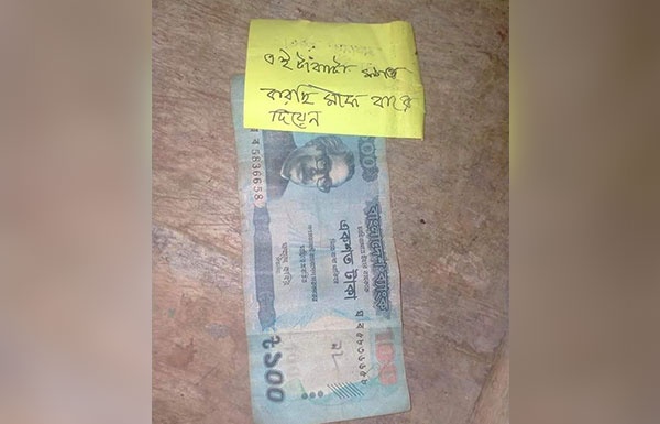 চিরকুটে লেখা ‘‘এই টাকাটা ক্ষতি করেছি মাফ করে দিবেন।’’ পরে খোঁজ নিয়ে দেখি আরও ৪জনের বাড়ীতে এমনভাবে টাকা ও চিরকুট লিখে গেছে। তারা হলেন একই এলাকার আবু বকরের ছেলে আব্দুল বারেক’র ঘরের দরজায় ১০টাকা, ঈসমাইলের ছেলে আব্দুস ছাত্তারের ঘরের দরজায় ৫০ টাকা, মৃত: শমসের আলীর ছেলে সাইদুরের ঘরের দরজায় ৩০ টাকা এবং ছফর আলীর ছেলে মজনু মিয়ার ঘরের দরজায় ১০০টাকা।