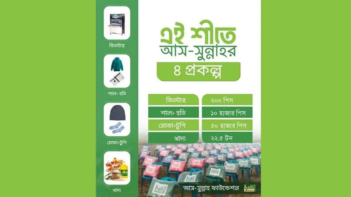 দেশজুড়ে চলমান শৈত্যপ্রবাহের মধ্যে অসহায় ও শীতার্ত মানুষের পাশে দাঁড়াতে চারটি মানবিক প্রকল্প হাতে নিয়েছে আস-সুন্নাহ ফাউন্ডেশন। শীতবস্ত্র, খাদ্য সহায়তা, শিক্ষার্থীদের জন্য শীত উপকরণ এবং বিশুদ্ধ পানির ব্যবস্থা—এই চার খাতে একযোগে সহায়তা কার্যক্রম পরিচালনা করবে সংগঠনটি।