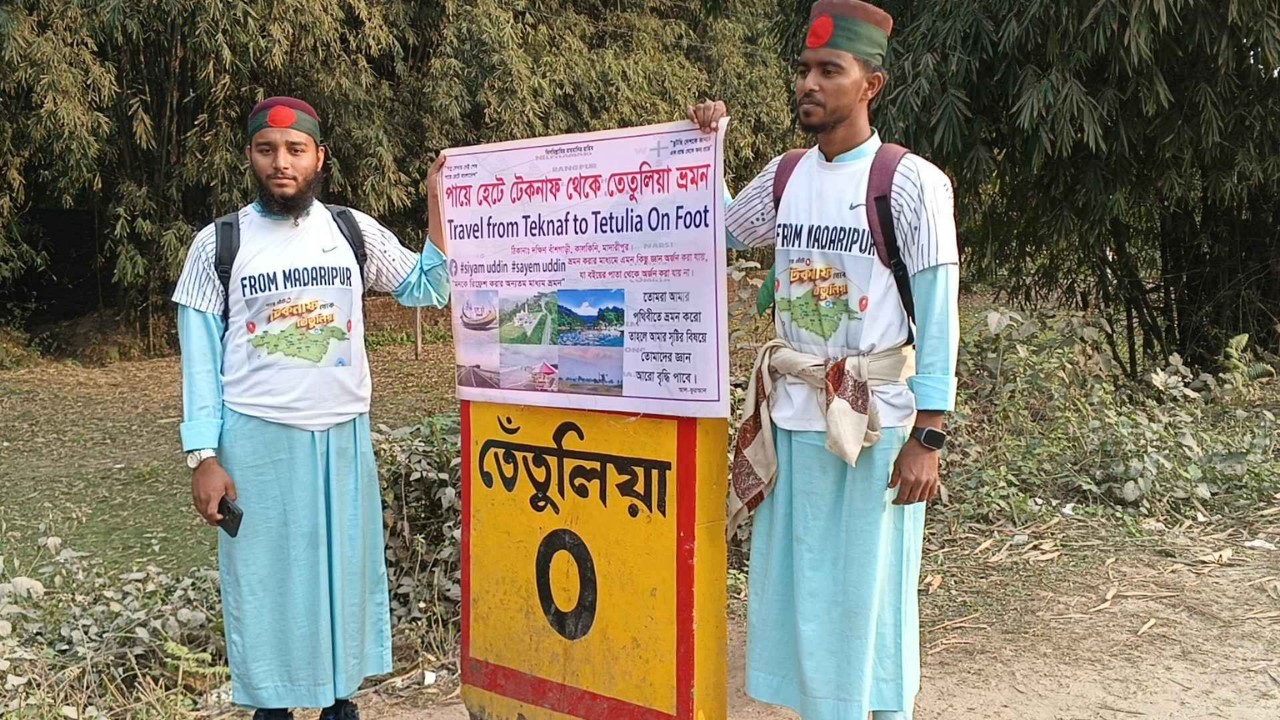 ‘ছুটছি দেশকে জানতে এক প্রান্ত হতে আরেক প্রান্তে’ এমন প্রতিপাদ্য নিয়ে পায়ে হেঁটে টেকনাফ থেকে তেঁতুলিয়া ভ্রমণ করলেন কোরআনের হাফেজ দুই ভাই।