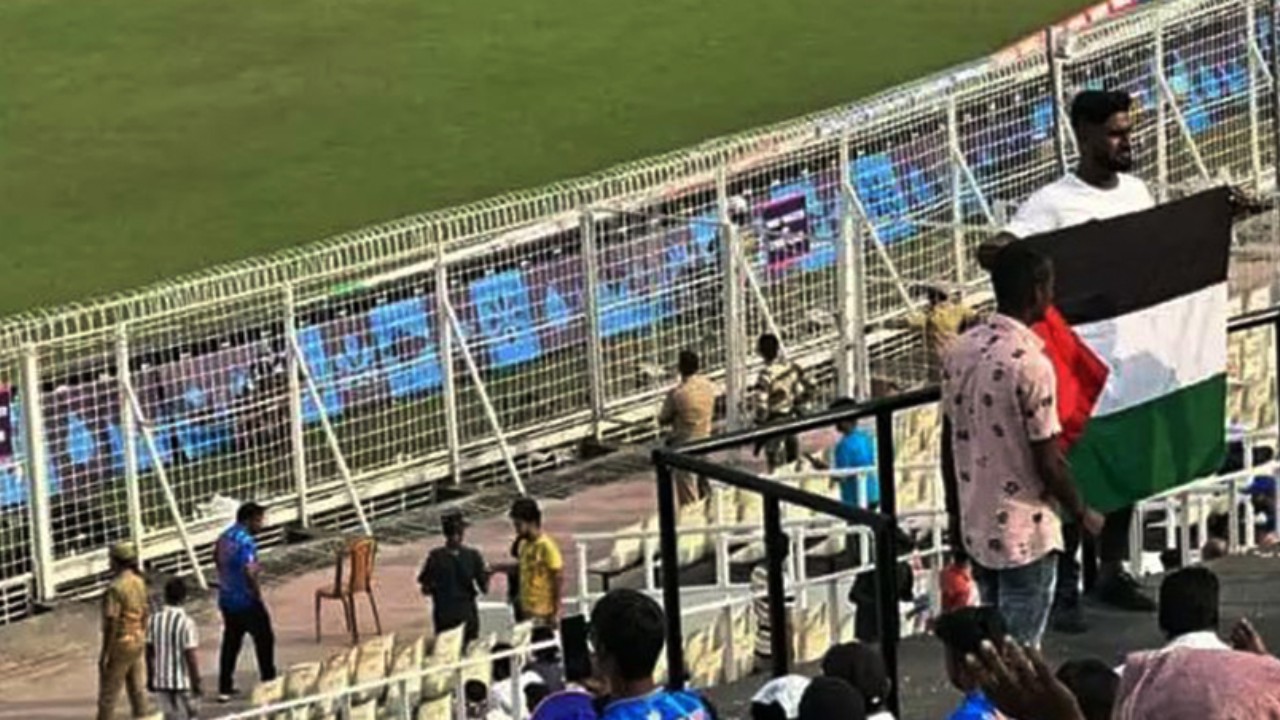 ইডেন গার্ডেন্সে পাকিস্তান-বাংলাদেশ বিশ্বকাপ ক্রিকেট ম্যাচ চলাকালীন ফিলিস্তিনের পতাকা হাতে এক যুবক। ছবি: টুইটার