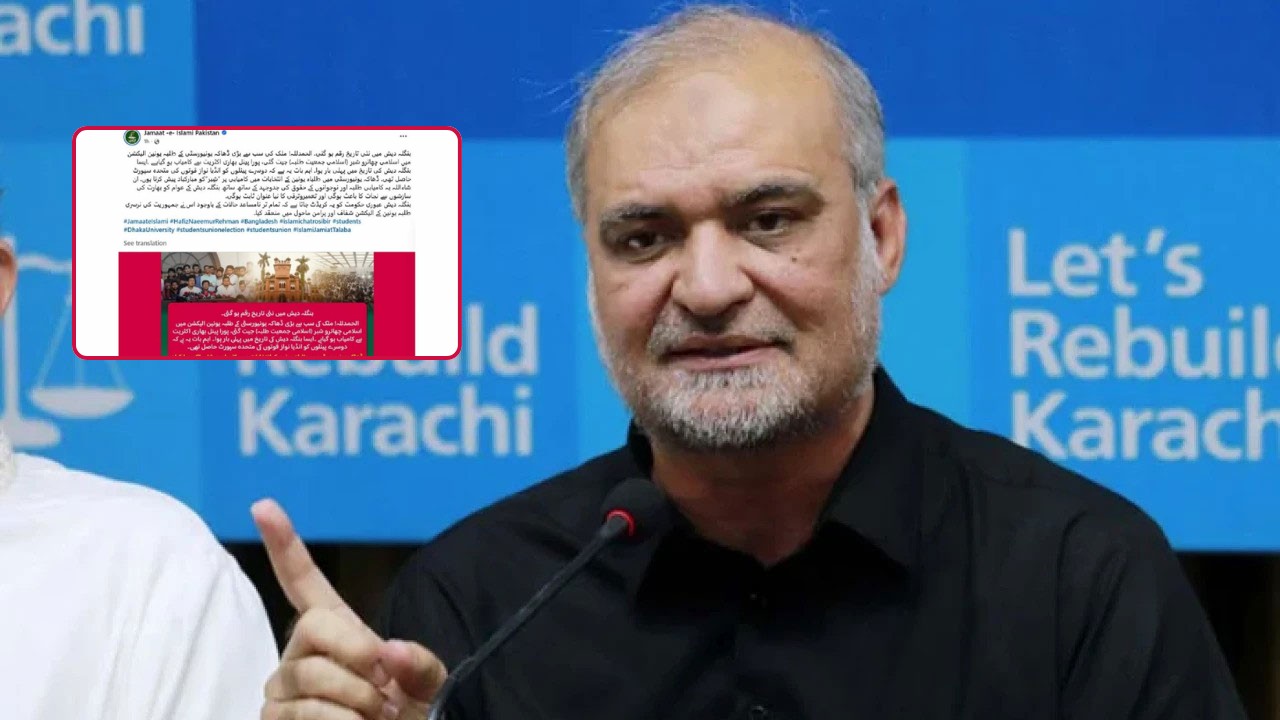 ঢাকা বিশ্ববিদ্যালয় কেন্দ্রীয় ছাত্র সংসদে (ডাকসু) ইসলামী ছাত্রশিবিরের ঐতিহাসিক বিজয়ে অভিনন্দন জানিয়েছেন জামায়াত-ই-ইসলাম পাকিস্তানের আমির হাফিজ নাঈম উর রহমান। বুধবার (১০ সেপ্টেম্বর) সংগঠনের অফিশিয়াল ফেসবুক পেজে তার বক্তব্য প্রকাশ করা হয়।