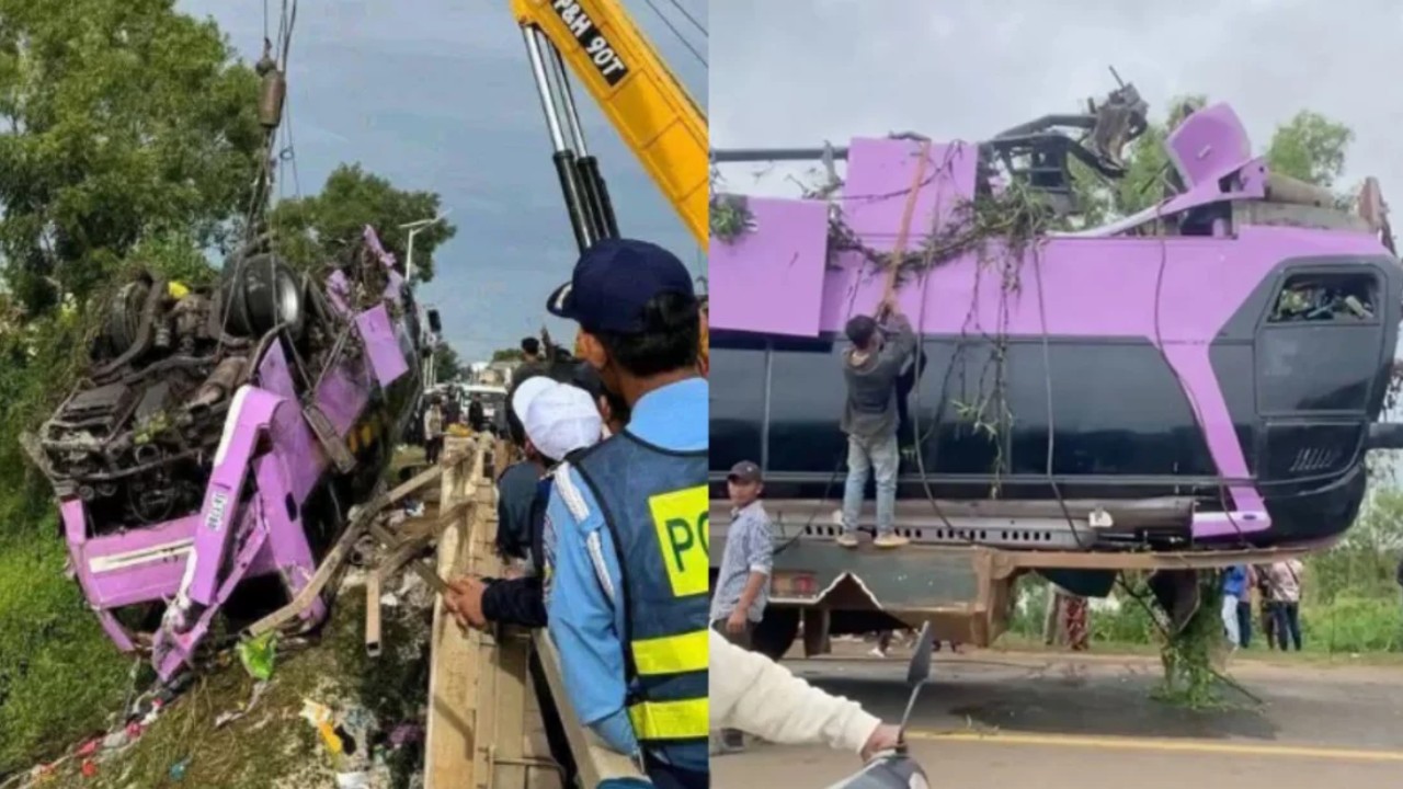 দেশটির স্বরাষ্ট্রমন্ত্রী সার সোখা ফেসবুকে দুর্ঘটনাস্থলের ছবি প্রকাশ করেছেন, যেখানে দেখা যায় ক্রেন দিয়ে অর্ধেক পানিতে ডুবে থাকা বাসটি টেনে তোলা হচ্ছে।