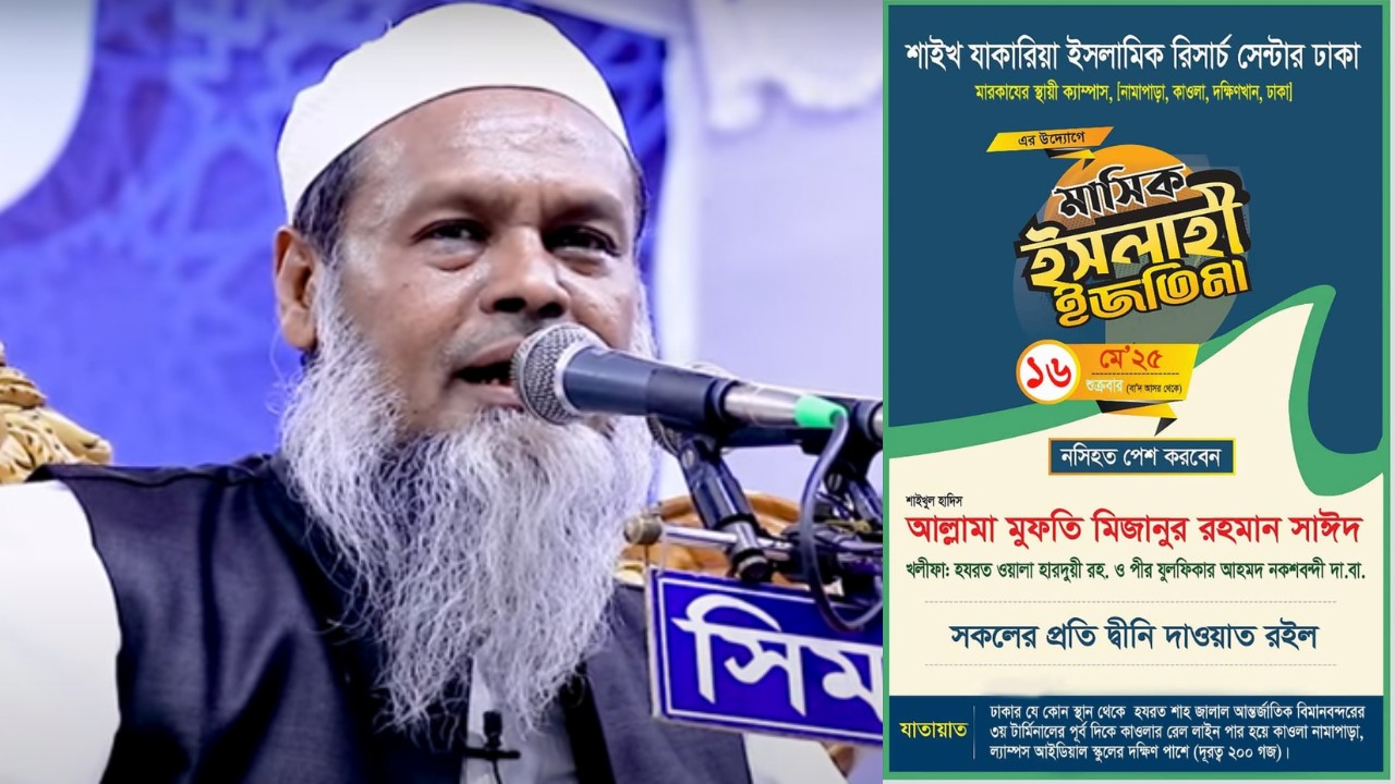 ঢাকার শাইখ যাকারিয়া ইসলামিক রিসার্চ সেন্টারের স্থায়ী ক্যাম্পাস, নামাপাড়া, কাওলা, দক্ষিণখানে আয়োজন করা হয়েছে মাসিক ইসলাহী ইজতিমা।