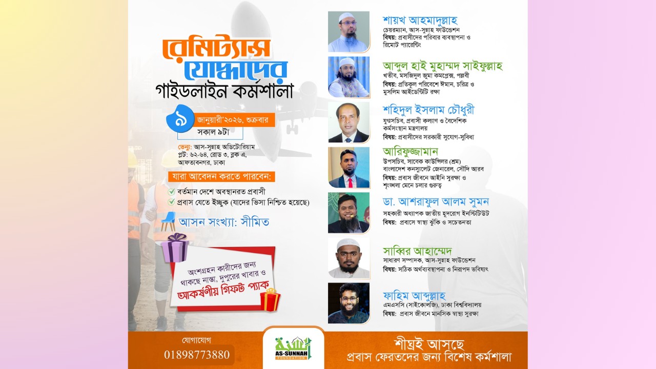 নানা সৃজনশীল কাজের পর এবার প্রবাসী রেমিট্যান্স যোদ্ধাদের জন্য গাইডলাইন কর্মশালার ঘোষণা দিয়েছে সেবা ও দাওয়াহমূলক স্বেচ্ছাসেবী প্রতিষ্ঠান আস-সুন্নাহ ফাউন্ডেশন।