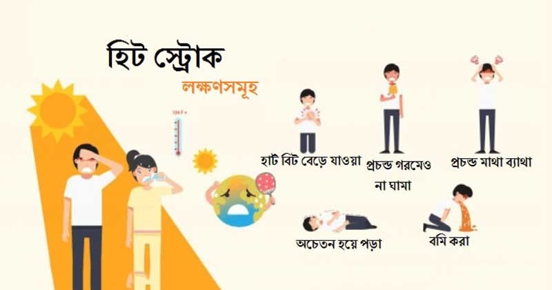 ৪. গরম আবহাওয়ায় যদি ঘাম বন্ধ হয়ে যায়, বমি বমি ভাব দেখা দেয়, তীব্র মাথাব্যথা হয়, শরীরের তাপমাত্রা বেড়ে যায়, প্রস্রাব কমে যায়, প্রস্রাবে জ্বালাপোড়া হয়, খিঁচুনি এবং অজ্ঞান হওয়ার মতো কোনো লক্ষণ দেখা দেয়, তাহলে অবিলম্বে হাসপাতালে যান এবং ডাক্তারের পরামর্শ নিন।