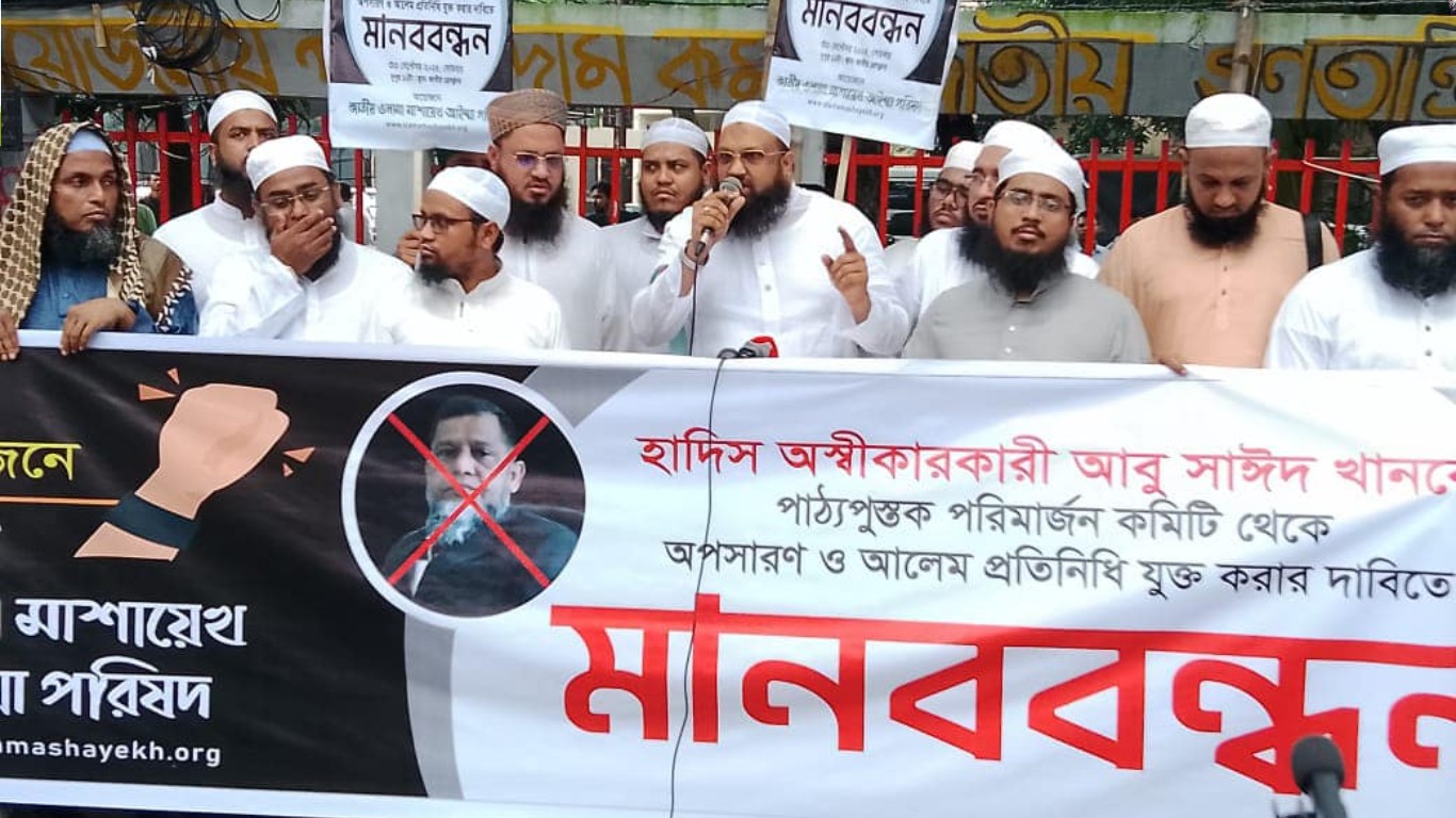 হাদিস অস্বীকারকারী আবু সাঈদ খানকে পাঠ্যপুস্তক পরিমার্জন কমিটি থেকে অপসারণ ও আলেম প্রতিনিধি নিযুক্ত করার দাবিতে মানববন্ধন করেছে জাতীয় ওলামা মাশায়েখ আইম্মা পরিষদ।