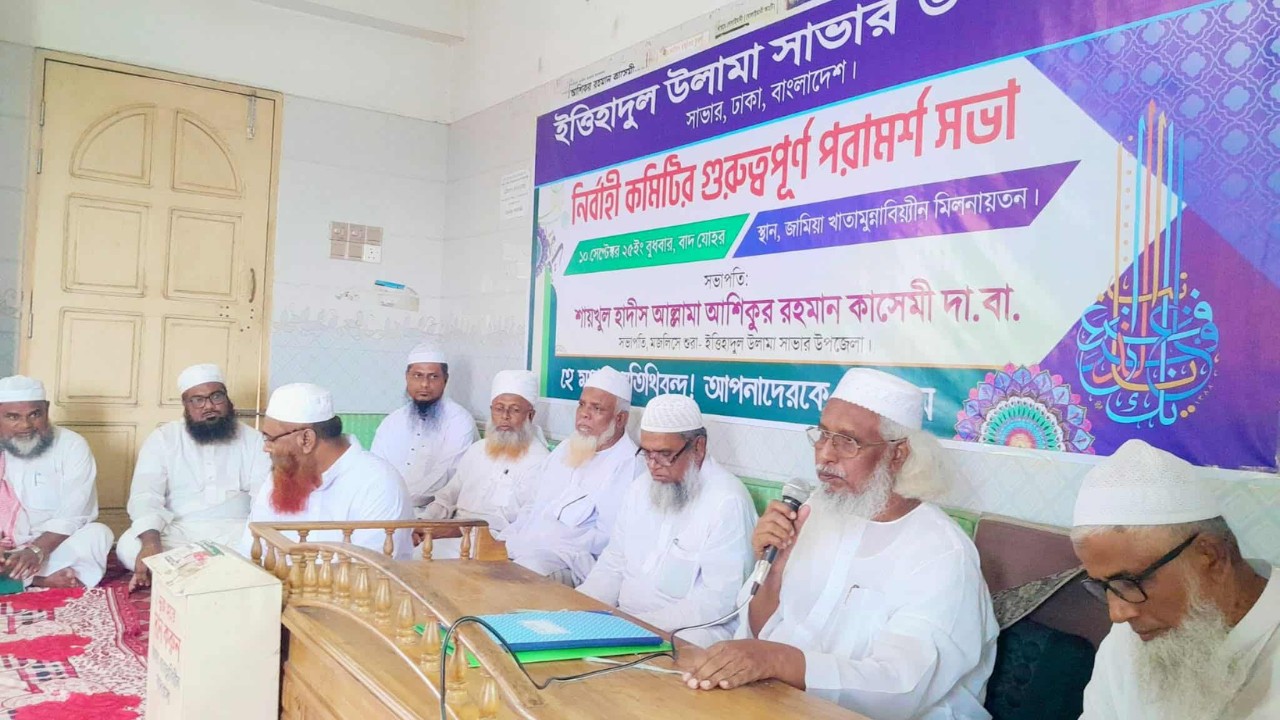 বুধবার (১০ সেপ্টেম্বর) সাভারের জামিয়া খাতামুন্নাবিয়্যীন মাদরাসা মিলনায়তনে ইত্তিহাদুল উলামার নির্বাহী কমিটির জরুরি পরামর্শ সভায় উপস্থিত নেতৃবৃন্দ এসব কথা বলেন। ইত্তিহাদের মজলিসে শুরার সভাপতি ও জামিয়া খাতামুন্নাবিয়্যীনের মুহতামিম শায়খুল হাদীস আল্লামা আশিকুর রহমান কাসেমীর সভাপতিত্বে প্রধান আলোচক ছিলেন ইত্তিহাদের নির্বাহী কমিটির সভাপতি ও যাদুরচর মাদরাসার মুহতামিম শায়খুল হাদীস হাফেজ মাওলানা আলী আকবর কাসেমী।
