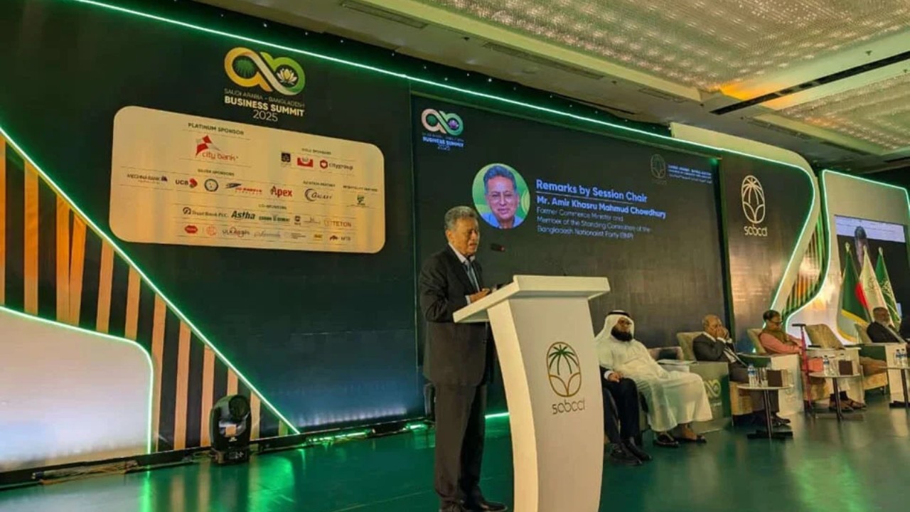 রাজধানীর হোটেল শেরাটনে সৌদি আরব-বাংলাদেশ চেম্বার অব কমার্স অ্যান্ড ইন্ডাস্ট্রি (এসএবিসিসিআই) আয়োজিত বিজনেস সামিট-২০২৫ অনুষ্ঠানে বক্তব্য রাখছেন বিএনপির স্থায়ী কমিটির সদস্য আমীর খসরু মাহমুদ চৌধুরী।