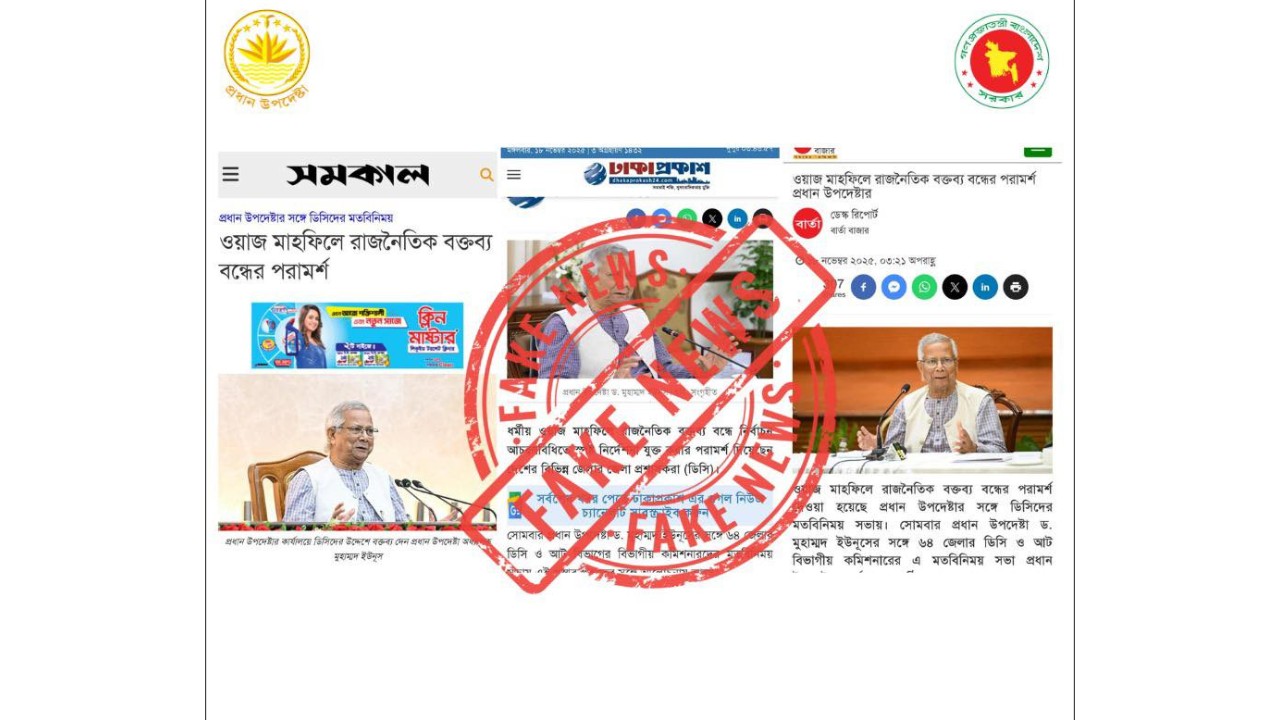 বার্তায় বলা হয়, কয়েকটি সংবাদপত্রে প্রকাশিত সংবাদে দাবি করা হয়েছে, গতকাল সোমবার (১৭ নভেম্বর ২০২৫) প্রধান উপদেষ্টা কার্যালয়ে অনুষ্ঠিত বৈঠকে জেলা প্রশাসকরা প্রধান উপদেষ্টাকে পরামর্শ দিয়েছেন ওয়াজ-মাহফিলে রাজনৈতিক বক্তব্য প্রদান বিষয়ে ব্যবস্থা গ্রহণের জন্য।