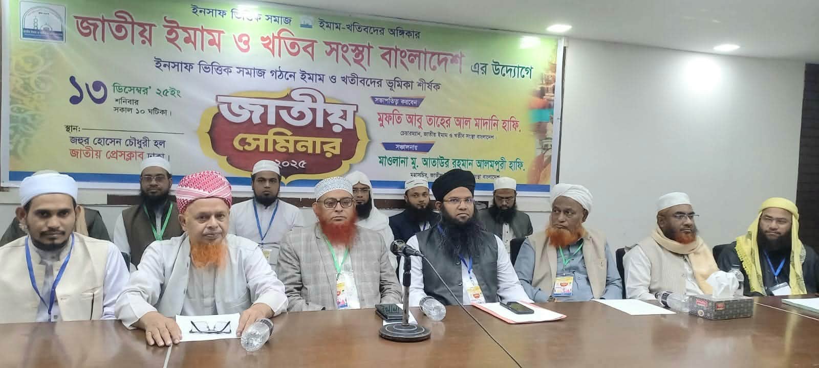 রাজধানীর জাতীয় প্রেসক্লাবের জহুর হোসেন চৌধুরী হলে দেশের বিভিন্ন মসজিদের ইমাম–খতিবদের নিয়ে অনুষ্ঠিত হলো ইনসাফভিত্তিক সমাজ গঠনে ইমাম ও খতিবদের ভূমিকা শীর্ষক জাতীয় সেমিনার। ইমাম–খতিবদের দ্বীনি দায়িত্ব স্বাধীনভাবে পালন, সামাজিক ও রাষ্ট্রীয়ভাবে তাদের মর্যাদা সমুন্নত রাখা এবং সামগ্রিকভাবে খতিব সমাজের পক্ষ থেকে ১০ দফা দাবি তুলে ধরার লক্ষ্যে এই সেমিনারের আয়োজন করা হয়।