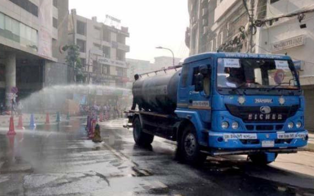 সড়কে জীবাণুনাশক ছিটাচ্ছে ডিএনসিসি