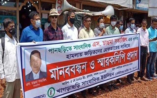 খাগড়াছড়িতে সাংবাদিক সত্যজিৎ চাকমার উপর হামলার প্রতিবাদে মানববন্ধন
