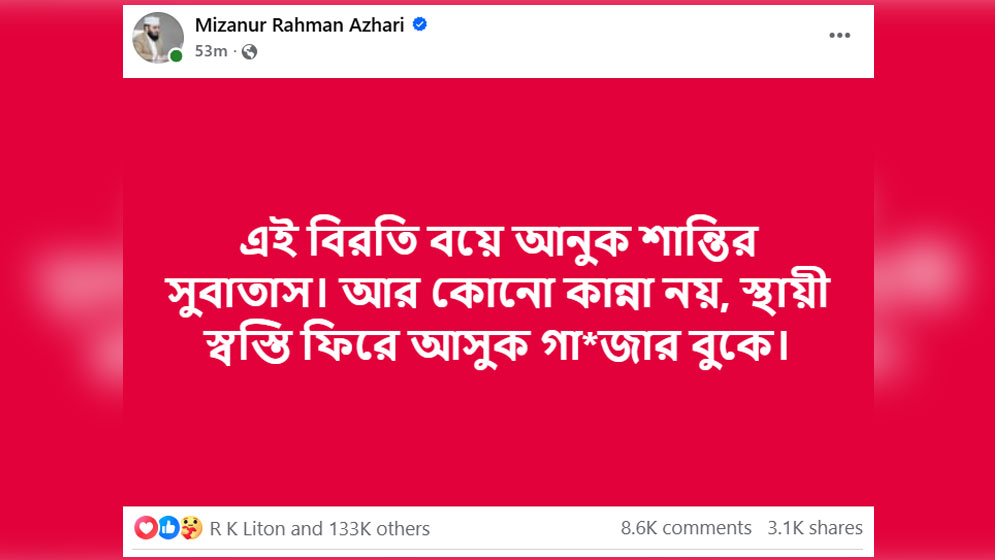 বৃহস্পতিবার (৯ অক্টোবর) রাতে দেওয়া ওই পোস্টে আজহারী লেখেন, ‘এই বিরতি বয়ে আনুক শান্তির সুবাতাস। আর কোনো কান্না নয়, স্থায়ী স্বস্তি ফিরে আসুক গাজার বুকে।’