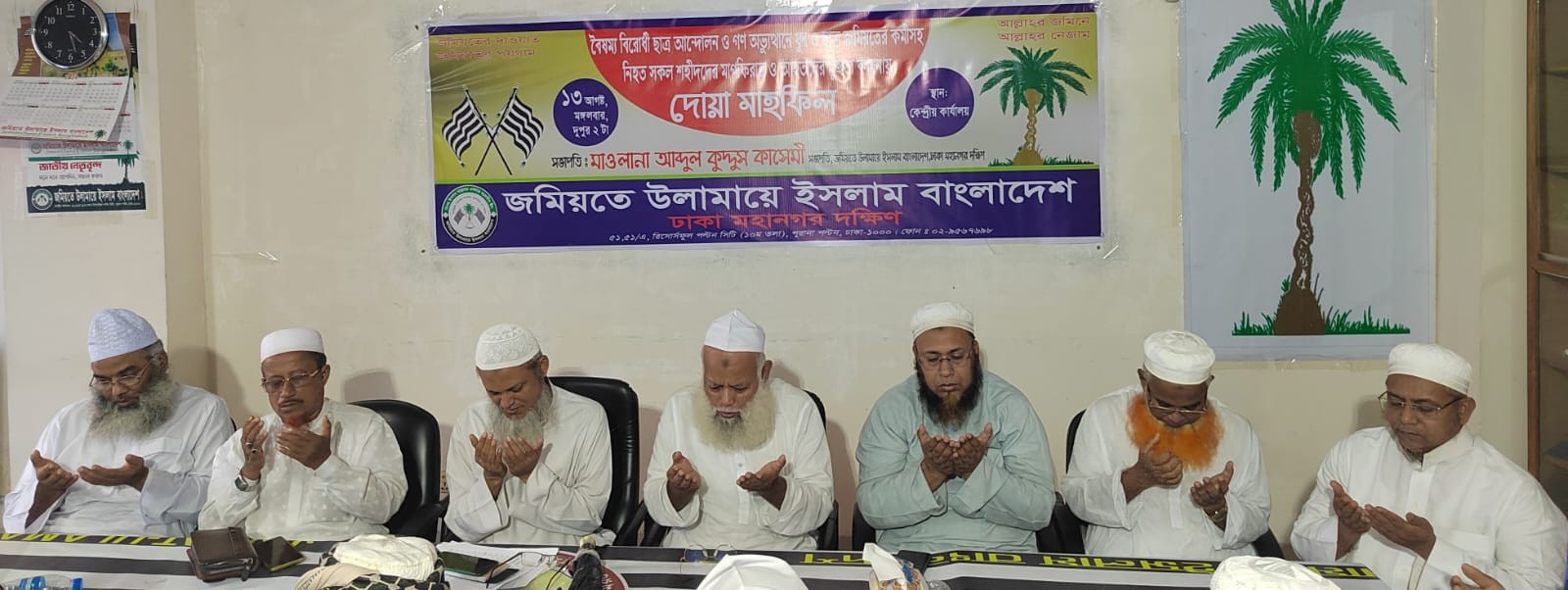 জমিয়তে উলামায়ে ইসলাম বাংলাদেশ ঢাকা মহানগর দক্ষিণের সভাপতি মাওলানা আব্দুল কুদ্দুস কাসেমী সভাপতিত্বে ও সাধারণ সম্পাদক মুফতি বশিরুল হাসান খাদিমানীর পরিচালনায় এই দোয়া মাহফিল অনুষ্ঠিত হয় ।