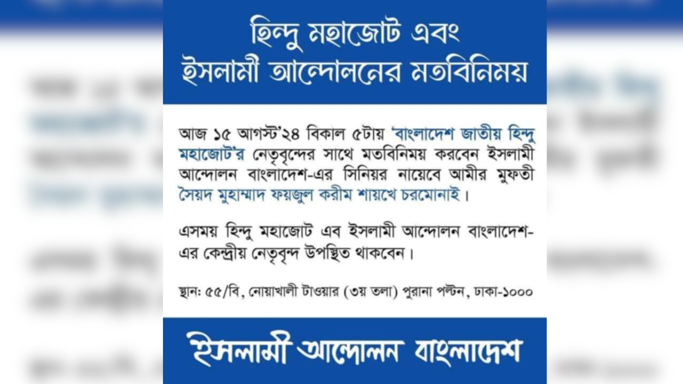 সভায় উপস্থিত থাকবেন হিন্দু মহাজোট এবং ইসলামী আন্দোলন বাংলাদেশের কেন্দ্রীয় নেতৃবৃন্দ।