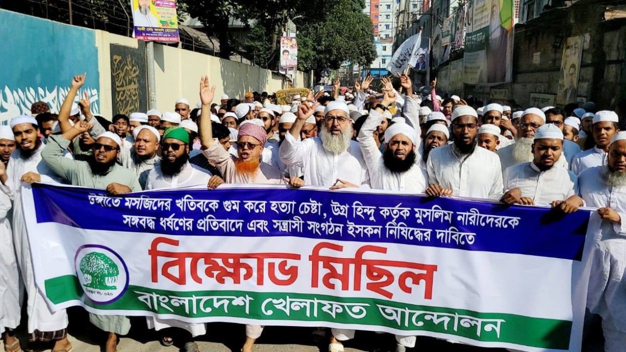 গাজীপুরের টঙ্গীর টিএনটি কলোনী জামে মসজিদের ইমাম মাওলানা মহিবুল্লাহ মিয়াজীকে গুম করে হত্যাচেষ্টা, মুসলিম ছাত্রীকে তুলে নিয়ে গণধর্ষণ, অ্যাডভোকেট সাইফুর রহমান আলিফ হত্যাসহ ইসকনের সকল অপতৎপরতা বন্ধ এবং সংগঠনটি নিষিদ্ধের দাবিতে শুক্রবার (২৪ অক্টোবর) বাদ জুমা রাজধানীর কামরাঙ্গীরচরে বাংলাদেশ খেলাফত আন্দোলন এক বিক্ষোভ মিছিল ও সমাবেশ করে। দলের আমির মাওলানা হাবিবুল্লাহ মিয়াজীর সভাপতিত্বে অনুষ্ঠিত সমাবেশে অন্যান্যের মধ্যে বক্তব্য রাখেন দলের মহাসচিব মাওলানা ইউসুফ সাদিক হক্কানী, নায়েবে আমির মাওলানা মুজিবুর রহমান হামিদী, সাংগঠনিক সম্পাদক মুফতি সুলতান মহিউদ্দিন, প্রচার সম্পাদক মাওলানা সাইফুল ইসলাম সুনামগঞ্জী, মুফতি আবুল হাসান কাসেমীসহ কেন্দ্রীয় ও মহানগর নেতৃবৃন্দ।