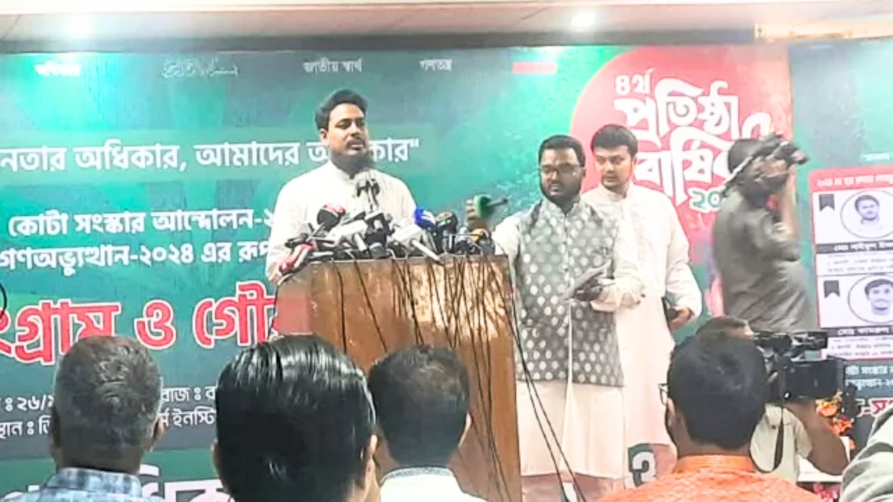 তিনি বলেন, আগামী নির্বাচনে কোনোভাবেই যেন ফ্যাসিবাদদের কেউ অংশগ্রহণ করতে না পারে সেটা আমাদের নিশ্চিত করতে হবে। আওয়ামী লীগ সামনে নির্বাচনে অংশগ্রহণ করছে না, সে ব্যাপারে সরকারের তরফ থেকে আমাদেরকে আশ্বস্ত করা হয়েছে। আওয়ামী লীগের কার্যক্রমকে নিষিদ্ধ করা হয়েছে। কিন্তু আওয়ামী লীগকে ফ্যাসিবাদী হওয়ার জন্য যে দলটা (জাতীয় পার্টি) সব থেকে বড় দায়ী, সেই দলটার ব্যাপারে এখনো সিদ্ধান্ত নেওয়া হয়নি। জাতীয় পার্টি কিন্তু জাতীয় পার্টি না। জাতীয় পার্টি মানেই আওয়ামী লীগ।