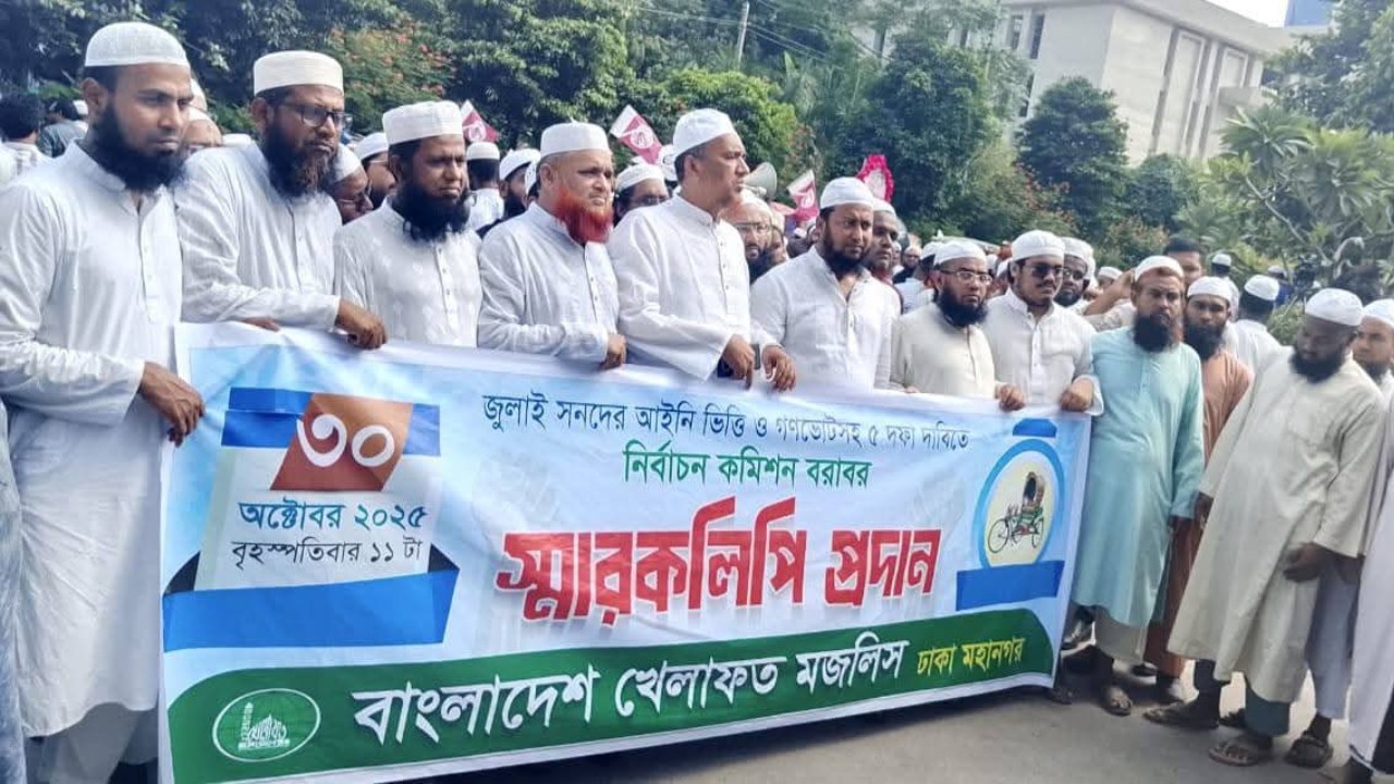 জুলাই সনদের আইনি ভিত্তি ও অবিলম্বে গণভোট আয়োজনসহ পাঁচ দফা দাবিতে আজ বৃহস্পতিবার (৩০ অক্টোবর) নির্বাচন কমিশন বরাবর স্মারকলিপি প্রদান করেছে বাংলাদেশ খেলাফত মজলিস। দলের মহাসচিব মাওলানা জালালুদ্দীন আহমদের নেতৃত্বে একটি প্রতিনিধি দল নির্বাচন কমিশন কার্যালয়ে প্রধান নির্বাচন কমিশনারের (সিইসি) সঙ্গে সাক্ষাৎ করে স্মারকলিপি প্রদান করেন। প্রধান নির্বাচন কমিশনার প্রতিনিধি দলকে আন্তরিকভাবে স্বাগত জানান।