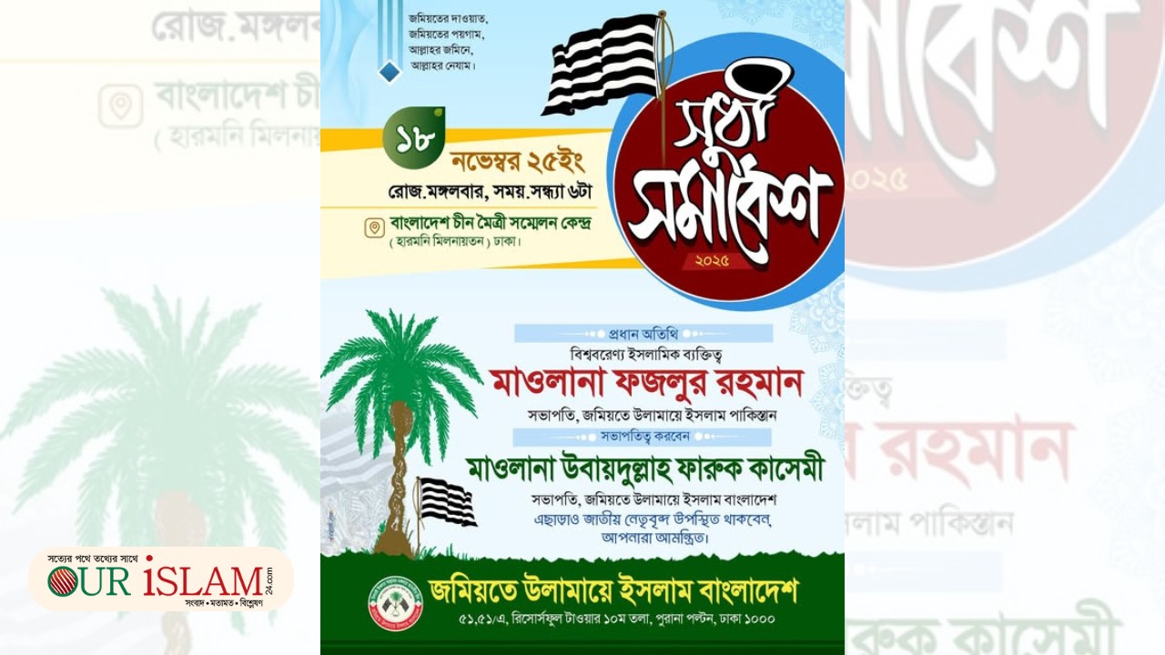 জমিয়তে উলামায়ে ইসলাম বাংলাদেশ আগামী মঙ্গলবার (১৮ নভেম্বর) রাজধানীতে এক সুধী সমাবেশের আয়োজন করেছে। ওইদিন সন্ধ্যা ছয়টায় বাংলাদেশ-চীন মৈত্রী সন্মেলন কেন্দ্রে (আগারগাঁও, ঢাকা) এই সুধী সমাবেশ অনুষ্ঠিত হবে।