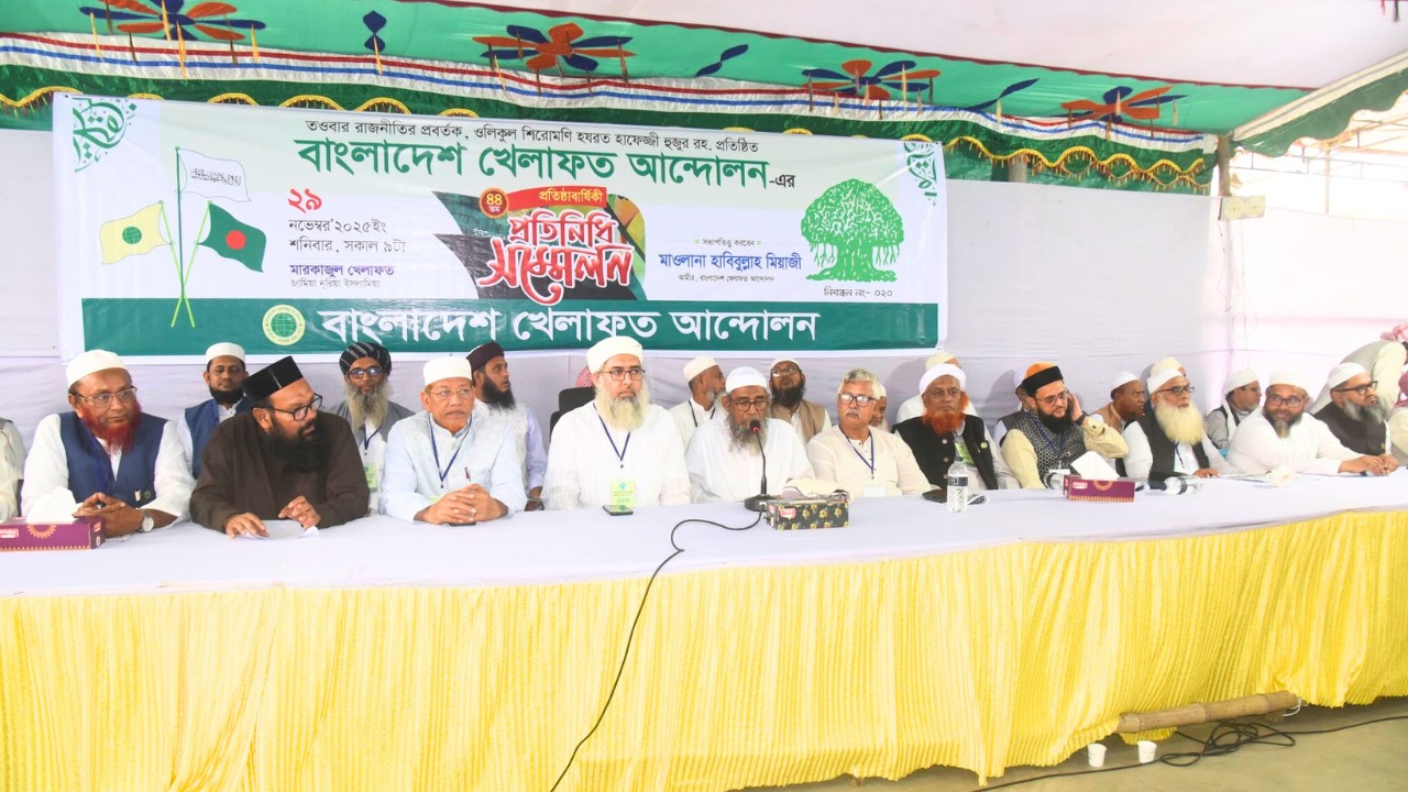 শনিবার (২৯ নভেম্বর) সকাল ১০টায় মারকাজুল খেলাফত কামরাঙ্গীরচর জামিয়া নুরিয়া ইসলামিয়া ময়দানে বাংলাদেশ খেলাফত আন্দোলনের ৪৪ তম প্রতিষ্ঠা বার্ষিকী উপলক্ষে কেন্দ্রীয় প্রতিনিধি সম্মেলন অনুষ্ঠিত হয়।