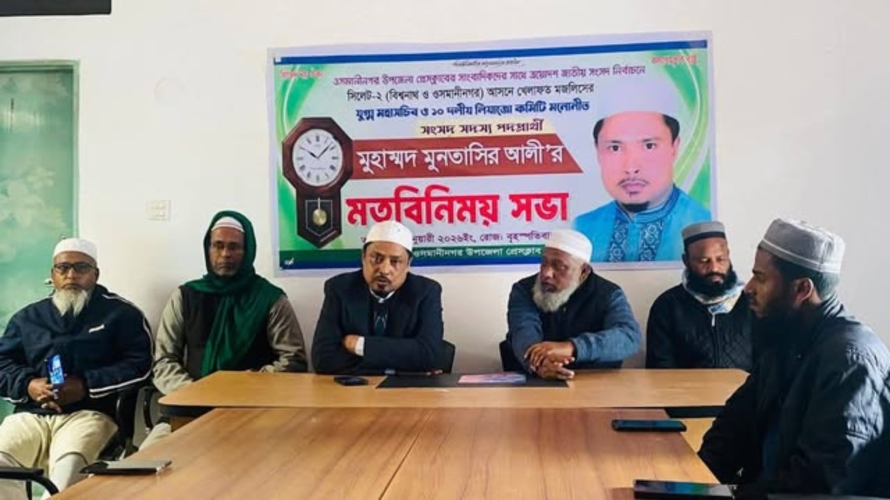 সিলেট-২ আসনে খেলাফত মজলিসের যুগ্ম মহাসচিব ও ১০ দলীয় লিয়াজোঁ কমিটি মনোনীত সংসদ সদস্য প্রার্থী মুহাম্মদ  মুনতাসির আলীর সঙ্গে ওসমানীনগর উপজেলা প্রেসক্লাবের সাংবাদিকদের মতবিনিময় সভা অনুষ্ঠিত হয়েছে।