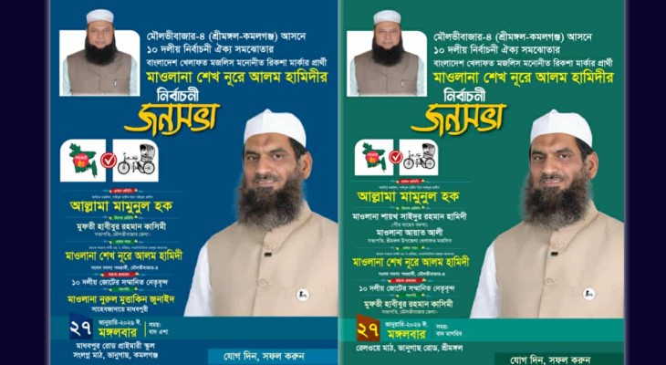 আগামীকাল মঙ্গলবার (২৭ জানুয়ারি) দুপুর ২টা বালাগঞ্জের ডি এন উচ্চ বিদ্যালয় মাঠে এই নির্বাচনী সভা অনুষ্ঠিত হবে। অনুষ্ঠানে বাংলাদেশ খেলাফত মজলিস আমির মাওলানা মামুনুল হক তার দলে প্রার্থী মাওলানা মুসলেহ উদ্দীন রাজুকে এলাকাবাসীর সামনে পরিচিত করাবেন এবং তার পক্ষে রিকশা প্রতীকে ভোট চাইবেন।
