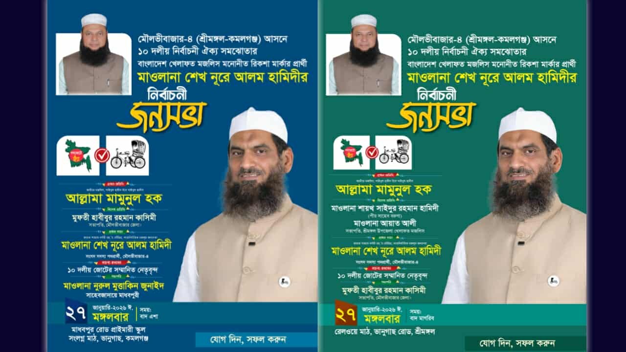 মৌলভীবাজার–৪ (শ্রীমঙ্গল–কমলগঞ্জ) সংসদীয় আসনে ১০ দলীয় জোট সমর্থিত ও বাংলাদেশ খেলাফত মজলিস মনোনীত সংসদ সদস্য প্রার্থী মাওলানা শেখ নূরে আলম হামিদীর পক্ষে নির্বাচনী জনসভায় অংশ নেবেন দলের আমির মাওলানা মামুনুল হক।
