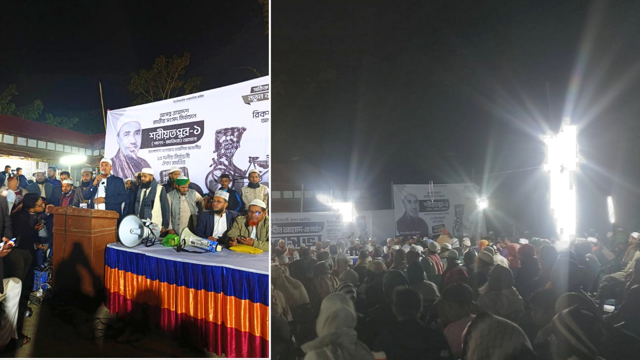 গতকাল ২৯ জানুয়ারি বৃহস্পতিবার সন্ধ্যায় শরীয়তপুরের জাজিরা উপজেলার মূলনা ইউনিয়নের লাউখোলা বাজারে ১১ দলীয় জোটের উদ্যোগে রিকশা মার্কা প্রতীকের সমর্থনে এক বিশাল নির্বাচনী জনসভা অনুষ্ঠিত হয়।