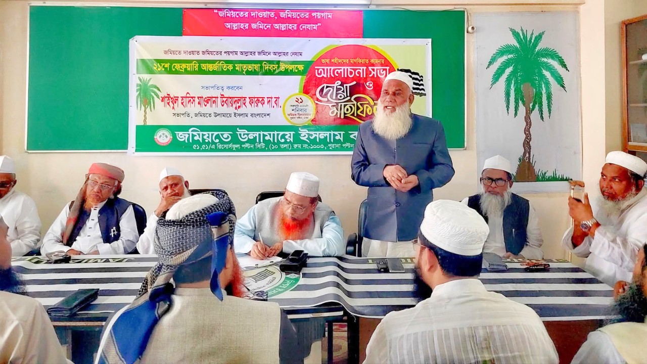 শনিবার (২১ফেব্রুয়ারি) মহান আন্তর্জাতিক মাতৃভাষা দিবস উপলক্ষে জমিয়তে উলামায়ে ইসলাম বাংলাদেশের উদ্যোগে দলের সভাপতি শাইখুল হাদিস মাওলানা উবায়দুল্লাহ ফারুকের সভাপতিত্বে ভাষা শহীদদের মাগফিরাত কামনায় আলোচনা সভা ও দোয়া মাহফিল অনুষ্ঠিত হয়।
